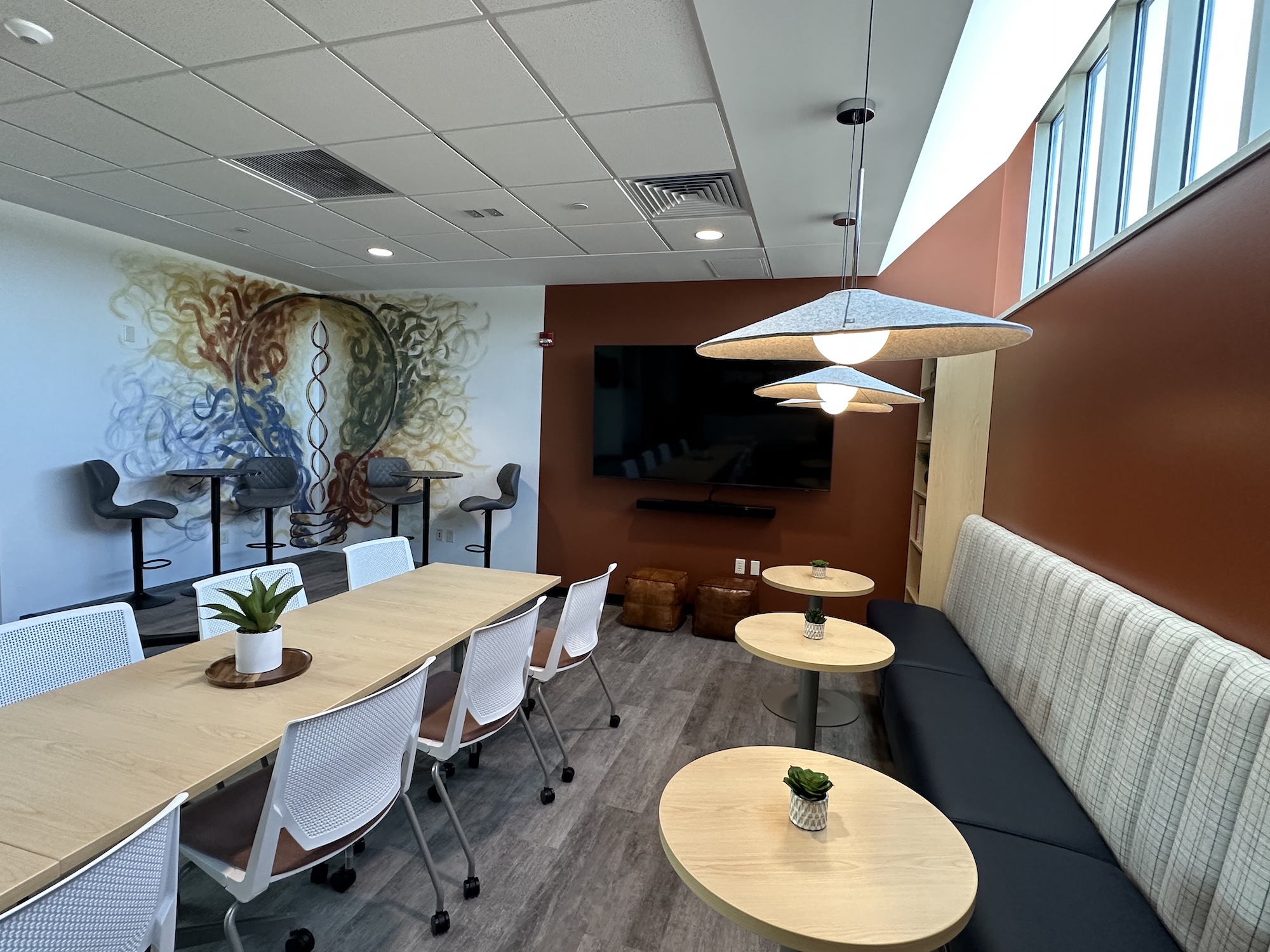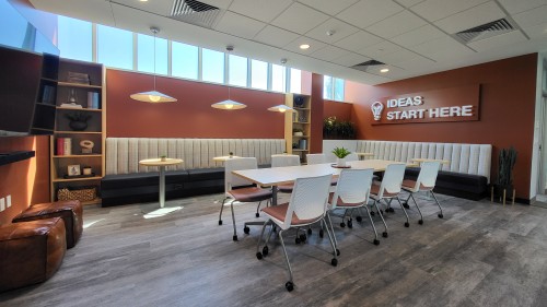 Renovations for the space occurred earlier this year, forming a suite of rooms that includes a café-like environment with booth and table seating, and a meeting room, both specifically designed to be multipurpose and flexible, suitable for informal and professional gatherings.