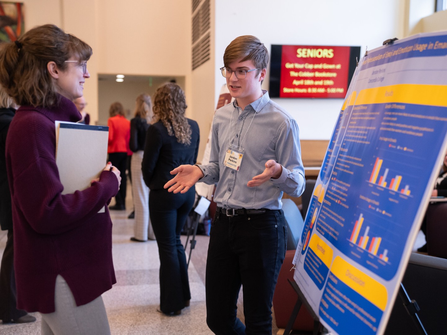 Communication Research definitely gave me the research bug. In this class, I was able to design and carry out my own study on the perceived professionalism of emoji and emoticons in email communication, and I presented my findings at COSS 2024. Having such a profound research experience during my first year has changed the way I approach research assignments in my other courses and helped me develop skills I’ve needed for this project.