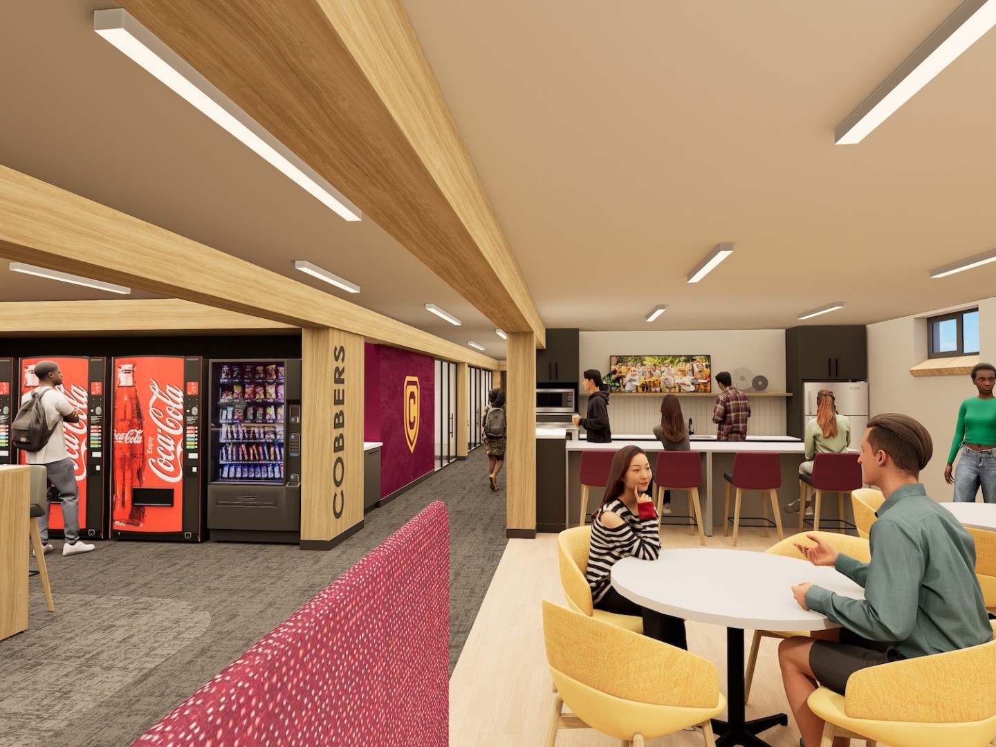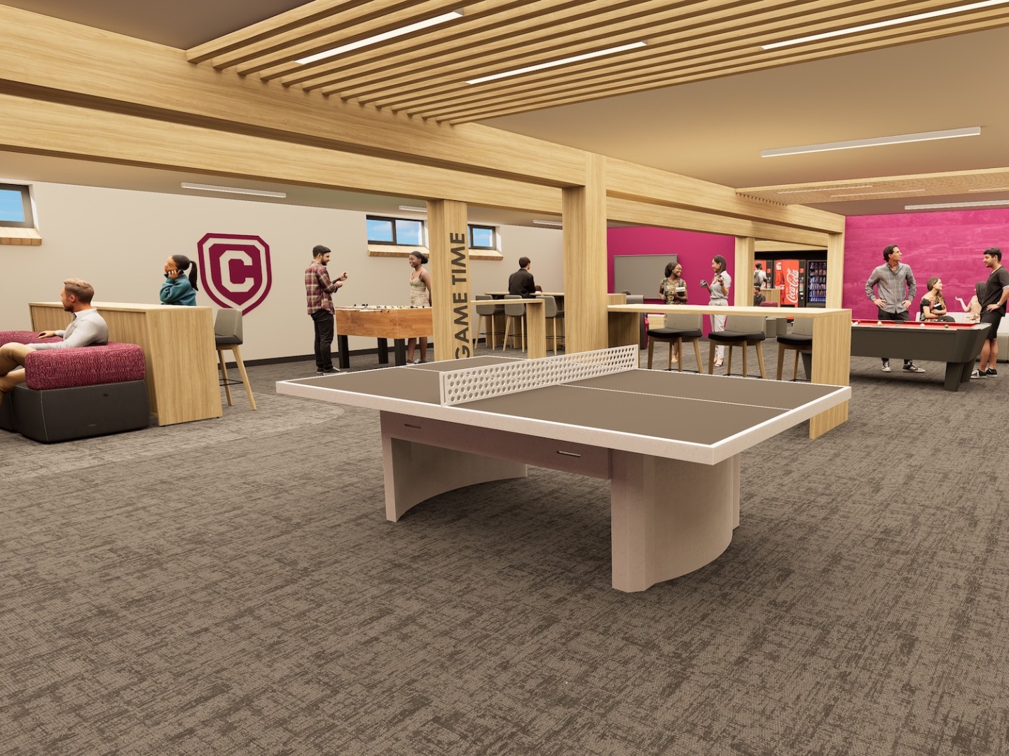 The Livedalen lounge will be remodeled in Fall 2026! Below are renderings of the game room and kitchen area (with study rooms in the background).